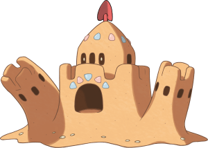 This Pokemon is something that I’ve wanted for a while a ghost sandcastle Pokemon called Sandygast. This Ghost/Ground type is a super cool because it is actually used as a test of courage. If a child puts their hand in its mouth the little sandcastle can control them and force them to make it bigger.