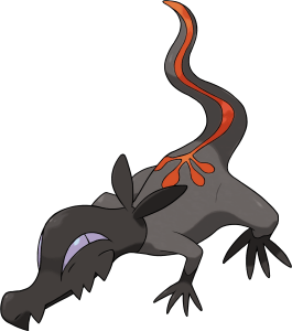 Salandit is the toxic lizard Pokemon clearly its name is a Portmanteau of Salamander and Bandit. This lizard may just be a member of my final team as he looks awesome. A poison/fire type this thief is ready to cause some trouble. Clearly those eyes indicate that he is up to no good.